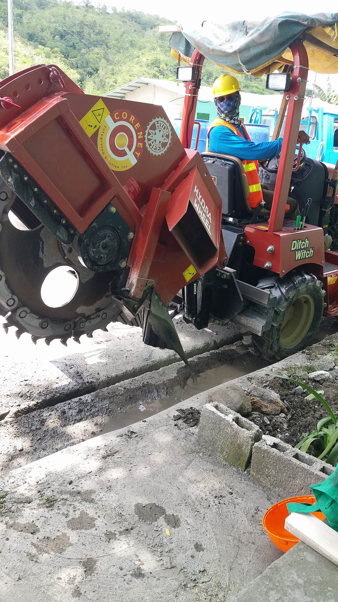 Microtrenching is an installation method in which a narrow and relatively shallow trench is cut, typically on one side of an asphalt roadway. Trench dimensions range from .75" - 2.25" (19.1 mm - 57.2 mm) wide and 8" - 16" (20.3 cm - 40.6 cm) deep. While cutting, a vacuum system connected to the cutter wheel attachment cleanly diver ts and transport ts the dry and dusty spoil away from the worksite. Once the conduit pipe is laid, the trench is backfilled with a grout compound.
